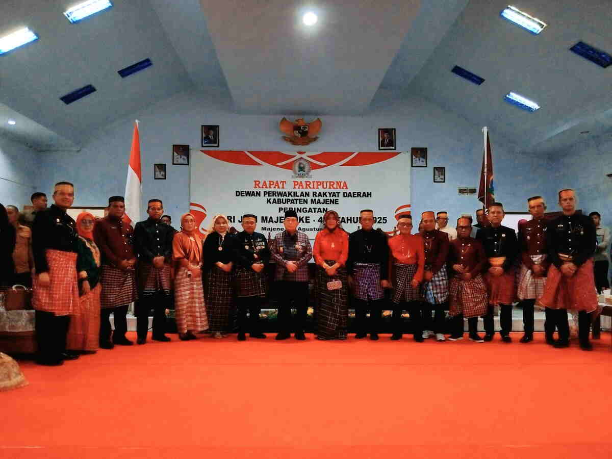 Majene,— Suasana khidmat dan penuh makna mewarnai Rapat Paripurna DPRD Kabupaten Majene dalam rangka Peringatan Hari Jadi Majene ke-480 tahun 2025, yang digelar di Gedung DPRD Kabupaten Majene, Jumat (15/8/2025). Kegiatan ini dihadiri langsung oleh Bupati Majene, Dr. H. Andi Achmad Syukri, S.E., M.M., bersama Wakil Bupati Majene, Dr. Hj. A. Ritamariani, M.Pd.