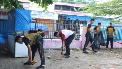 Polres Majene – Wujud kepedulian terhadap kebersihan lingkungan terus ditunjukkan oleh jajaran Polres Majene. Hal itu terlihat saat personel kepolisian turut ambil bagian dalam kegiatan kerja bakti yang digelar di kawasan Pasar Sentral, sekitar taman kota hingga pelabuhan Majene, Kamis (23/4/2026).